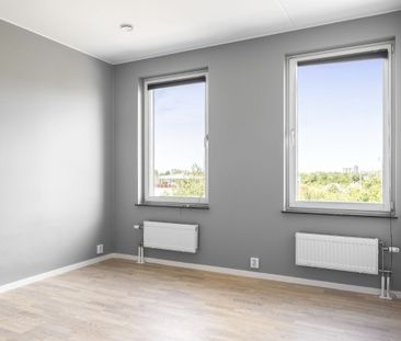 Modern tvåa med balkong mot grönskande innergård i Elineg...